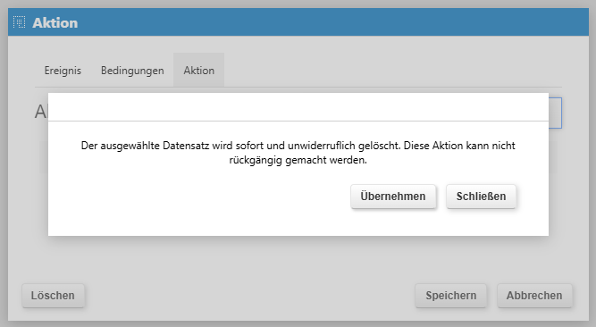 Die dritte Registerkarte Aktion beinhaltet abschließend die Aktionen, die bei positiver Prüfung der Bedingung(en) durchgeführt werden. Es stehen folgende Aktionen zur Verfügung