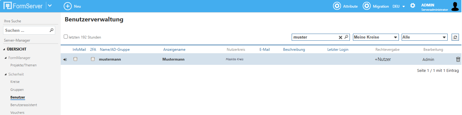 Über die Schaltfläche Neu im oberen Menüband des Servers kann ein neuer Benutzer registriert werden. Mit einem Klick auf den Namen eines vorhandenen Benutzers können dessen Attribute bearbeitet werden. Über das Papierkorb-Symbol am Ende einer Zeile können Benutzer gelöscht werden.